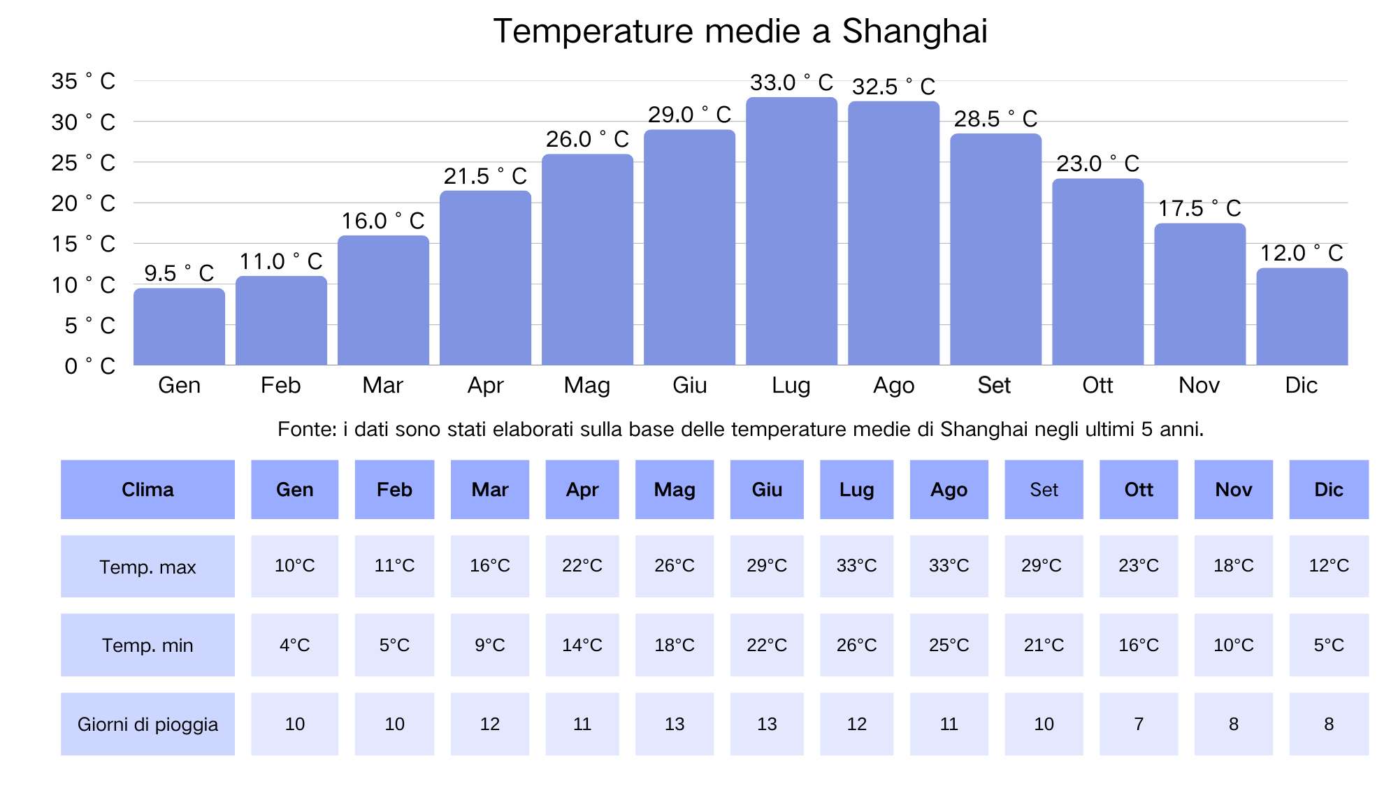 Cina centrale | Da Apr a Ott (da 22 °C a 35 °C ) | Da Nov a Mar (da 5 °C a 10 °C) | Piogge del Mei Yu a giugno/luglio (piogge persistenti). |
