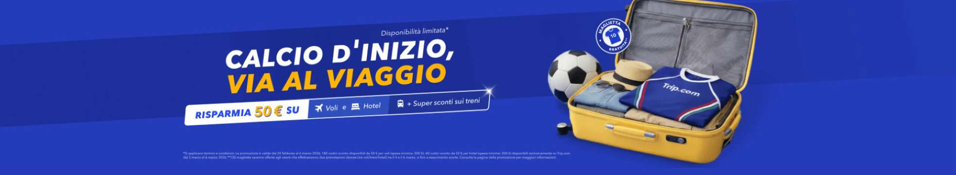 Scopri offerte imperdibili su voli, hotel e treni verso destinazioni in tutto il mondo. Prenota due diversi prodotti di viaggio tra il 4 e il 6 marzo e ricevi gratuitamente una maglietta da calcio dell'Italia in edizione limitata, disegnata esclusivamente da Trip.com. Disponibile fino ad esaurimento scorte.
