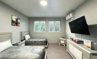 • Living Room: Spacious and inviting, with a flat-screen TV, and eclectic decor that pays homage to Lebrón’s life and activism. Perfect for relaxing after a day of exploring.