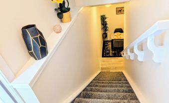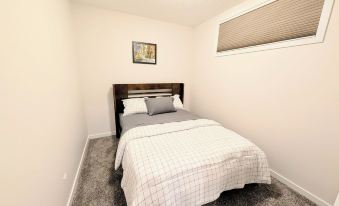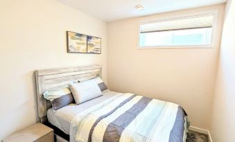 This elegantly designed basement suite offers a refined blend of comfort and functionality, accessible via a staircase leading to a thoughtfully curated living space. The inviting lounge area is tastefully furnished, featuring a plush recliner sofa and a smart TV equipped with Netflix and an array of cable channels for your entertainment. The suite comprises two well-appointed bedrooms—each with a luxurious queen-size bed —ensuring a restful stay. A high-speed internet caters to professionals and remote workers alike.