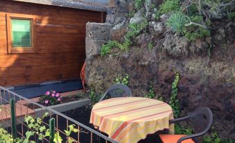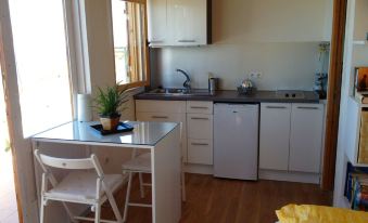 Furnished with cooking facilities and sleeping facilities for two people. Outside there is a barbecue area.