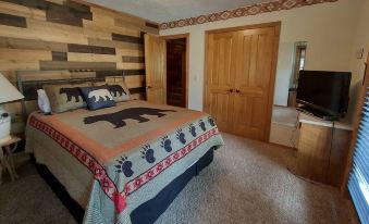 The upper level features a great room with vaulted tongue and groove ceilings and a cultured stone wood burning fireplace for a real mountain cabin feel. The great room extends to the updated kitchen with breakfast bar and a dining area. Enjoy watching your favorite shows and movies on the large 85" flat screen smart TV. The living room opens up to a huge deck where you can relax at the large patio table while grilling dinner or watching the plentiful wildlife. It’s the perfect place to enjoy your morning coffee while taking in the amazing views. The master bedroom with ensuite bath is also on this level. With a king bed, Roku smart TV and windows to take in the mountain views, you’ll have everything you need to relax. There’s private access to the deck from the master bedroom. You’ll be wowed by the enormous ensuite bathroom featuring a corner jetted tub and beautifully tiled shower. This level of the house also features a lovely half bath.