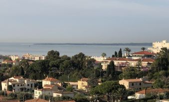 The living room extends onto a terrace with a panoramic view of the sea and the Lérins Islands. There is an electrically operated blind and air conditioning.