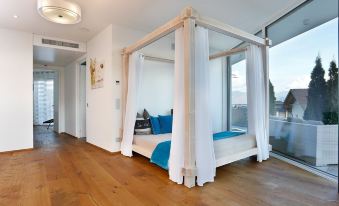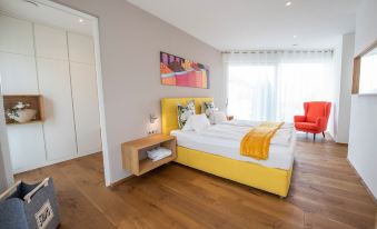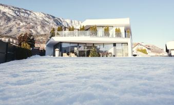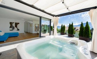 The newly built 235 m² architect's villa AICH, located directly on the South Tyrolean Wine Road, impresses with its modern, cozy character and awaits you with a spacious, fully equipped kitchen, a spacious dining area as a meeting point for nice hours, 4 bedrooms, 1 open Sleeping area with four-poster bed in the lounge,