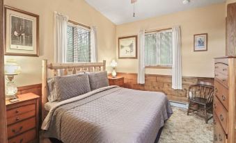Main level offers laundry- mud room/bathroom, large bedroom with 2 single beds and a twin bunk bed which is a perfect bedroom for the kids. It also has its own 50” flat screen TV with newly added Starlink satellite internet and Blue Ray DVD player. Fully furnished kitchen including some spices with island which opens up to a dining and great room with 20' floor to ceiling brick (gas) fire place. New for 2020- full vinyl flooring in both great room and kitchen. Deep cleaned for our guests. We offer indoor/ outdoor wifi on the grounds