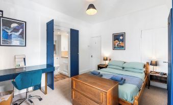 The cottage sleeps up to five across two rooms. The master has a double bed, ensuite shower, desk, and blackout curtains. The second bedroom has a bunk bed with a double below and single above, plus a desk and blackout curtains.