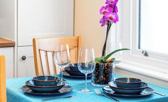 The spacious kitchen is fully equipped with an oven, hob, microwave, fridge-freezer, dishwasher, cookware, and utensils. There’s also a washing machine for longer stays. A pull-out dining table with chairs for five makes it easy for families and friends to eat together. Complimentary tea, coffee, cereal, and milk are provided for your first breakfast.