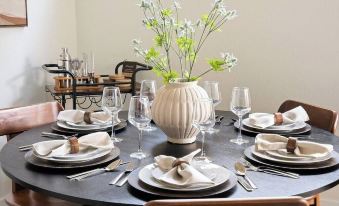 The four bedrooms offer a relaxing retreat after a day of exploring. Each comes with a smart TV and its own bathroom offering convenience and privacy for all guests. The main house has 3 bedrooms and 3.5 bathrooms, while the extra detached unit offers a 4th bedroom and bathroom. There are two master bedrooms with King size beds and ensuite bathrooms. The 3rd bedroom in the main house has a queen size bed and bathroom right outside of the bedroom. The detached unit bedroom has 2 double beds with ensuite bathroom as well. Each bathroom is stocked with the basics of body soap, shampoo and conditioner.