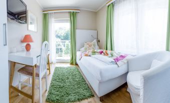 Positiv: sehr nette Betreiber und wirklich freundliches Personal. Überdurchschnittlich gutes Frühstück mit selbstgemachten Säften und Marmeladen, alles wurde sofort nachgefüllt. Dass das Geböck Aufbackware war, ist wahrscheinlich kaum anders möglich, störte aber nicht. Das Zimmer und das Bad waren ordentlich gereinigt, der Balkon ausreichend groß. Sehr gutes Bett und ruhige Lage, wir haben ausgezeichnet geschlafen! Negativ: Das Zimmer war sehr klein und wahrscheinlich auch aufgrund der dunklen Möbel sehr finster. Es gab sehr wenig Stauraum, weil die Möbel hauptsächlich aus zusammengebauten Platten ohne Laden oder Fächern bestehen. Die einzige Ablagefläche, der Schreibtisch, war durch ein TV-Gerät verstellt, das ürsprünglich wohl an der Wand montiert war (siehe Foto). Es gab auch zu wenig Haken/Aufhängemöglichkeiten in Zimmer und Bad. Wir kamen ja, um auch die Therme zu nützen und da will man ja Bademäntel, Badetücher etc. aufhängen. Fazit: Für ein paar nette Tage durchaus den Preis wert, aber nur, wenn man wenig Dinge mithat und hauptsächlich zum Schlafen kommt.