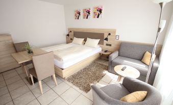 bon accueil dans cet endroit plaisant situé à 30 minutes des thermes par le service de bus ( gratuit avec la carte invité si vous réservez 3 nuits) j'y ai séjourné dans une chambre simple pour profiter de quelques jours de détente à Vita classica (royal comme endroit !) l'appartement est grand et trés bien équipé avec kitchenette fonctionnelle, grille pain et bouilloire pour compléter la petite vaisselle. il y'a un micro onde à disposition dans une salle au rdc !! à noter pas de chaînes françaises mais un large choix de programmes allemands wifi fonctionne bien l'endroit est bien sécurisé avec possibilité de profiter d'espace de jeux ( ping pong, billard) et une salle de sport bien équipée d'appareils elle aussi. la propriétaire des lieux parle anglais et très peu le français. elle se rend disponible pour tous besoins je recommande cet endroit pour la propreté des lieux , le calme et le prix abordable.