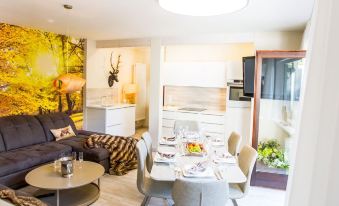 Each room shines individually in the beauty of a season - as beautiful as the Harz itself. The ground floor is the sunlit living-dining area "autumn" with open kitchen, large terrace and the bedroom "winter" and a bathroom. Upstairs are the spacious bedrooms "Spring" and "Summer". Each room has a private bathroom and a balcony with forest views.