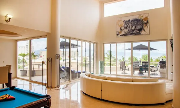Large, luxurious two-story Penthouse located in Nuevo Nayarit in the gated community of Quinta del Mar right on the best beach in all of the bay. Located less than 20 minutes from Puerto Vallarta airport, the complex is close to shopping, cinemas, entertainment, medical care and is close to several excellent restaurants close by.