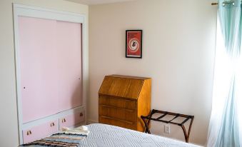 Both our green and blue, and blue and pink pastel, themed rooms have a queen bed and tons of classic, 1950s built-in storage. For those who need a dedicated workspace, the blue and pink room also has a beautiful antique desk.