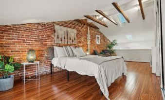 This historic 2-bedroom, 1-bathroom 1870s rowhouse has been fully updated with a walk-in glass shower, washer/dryer, airy sunroom with classic arcade gaming console, string-lit backyard, dedicated office space, wood flooring throughout, and a romantic, exposed-brick-and-beam 3rd floor loft.