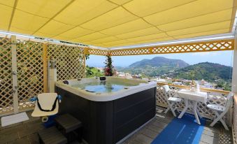 From My Dream House Ischia, you can use a SPA, or heated whirlpool with aromatherapy and chromotherapy, comfortable for 5 people and filled with clean water at each guest change. The tank is equipped with a lift with a rigid chair, specific for people with reduced mobility and with a maximum capacity of 135 kg. Upon exiting the SPA, you can take advantage of the heated shower by sitting on the lift chair. The SPA is also located inside a gazebo with extendable cover tent, in a sheltered and peaceful place from which you can enjoy a splendid panorama of the Gulf of Naples, the Maronti bay and the Isle of Capri.