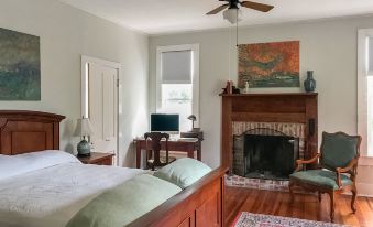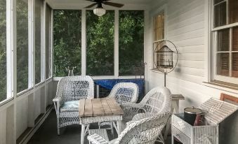 With a fireplace on both floors, the upstairs has three inviting, serene bedrooms and two recently updated baths (one with a large bathtub and a view of treetops and sky and the other with a waterfall shower). You can enjoy your coffee and breakfast in the morning or drinks and hors d'oeuvres in the evening on the breezy, upstairs (and screened-in!) sitting porch with views of the sky, birds and the garden’s enormous bay trees. Downstairs, the dining room, living room and parlor are welcoming communal spaces, while the kitchen is a chef’s dream with cast iron pots and cooking ware collected over the years by Catine Perkins, a noted organic gardener, cook and artist. Coffee and tea are ready to be made, and if you wish to cook, you can check out the chicken coop in the back for eggs, pick out fresh herbs in the garden, and use whatever condiments are available in the kitchen. There are plentiful places to shop for groceries nearby.
