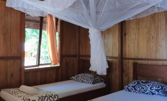 We couldn’t recommend this small resort with more enthusiasm! The English and Indonesian speaking European owners are personally involved in every aspect of the resort operation and their wonderful staff are always attentive and friendly. The eight bungalows, four in front on the beach and four offset behind the beachfront bungalows (allowing an open view of the bay) all have showers and toilets. The front bungalows feature large French doors that open to the wrap-around deck. All the bungalows have two delightful hammocks and two large cushioned chairs. The four-poster queen beds are comfortable and enclosed by mosquito nets. The small bay in front of the resort has an abundance of coral and teeming with fish. The water is warm and generally calm. The resort has a full-service dive center and can provide guests with both snorkel and SCUBA gear. The three meals and afternoon snack are generous, the food is delicious, and always more than enough. The sand is powdered coral and feels as fine as talcum powder. While mosquitoes are present in the morning and early evening, their numbers are small; we used a small amount of repellent which was completely effective. The resort will pick you up at the ferry dock in Wakai and drop you off at the end of your stay. It is included in the rate. The hosts will arrange snorkeling and diving trips and will also help arrange transportation both to and from the resort. They made our stay perfect. You can WhatsApp before booking for answers to all your questions. The quiet beauty of Harmony Bay is intoxicating.