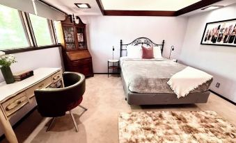 1 Queen bed. 32 in TV. Comfy lounge chair. Desk and chair. Dresser. Closet space. Water and forest views. Full bathroom in the hallway.