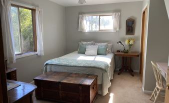 Fully equipped retro kitchen and welcoming living room. Large, private, backyard teeming with trees, fruit, and a fantastic large picnic table for eating, relaxing with friends and family, and enjoying beautiful days and evenings that the valley offers. The family-friendly yard offers hours of exploration and fun.