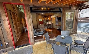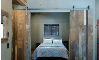 Bedroom 2 boasts a Queen bed with luxurious linens and memory foam topper. Daydream out the 5' wide opening barn doors through the living space out the wall of glass garage door of what adventure awaits.