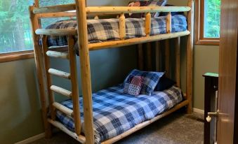 The family room has a functioning wood burning fireplace, large bay window and spacious sectional couch that opens to the dining room where you can sit up to 8 people. The kitchen has the original handmade knotty pine cabinets, refrigerator, stove, pots, pans, new silverware, cooking utensils, cutting boards, new glasses and wine glasses, coffee mugs, coffee maker, toaster and microwave. We also have plates, cups and utensils for the kiddies! While preparing meals, enjoy the views of the lake or woods. Does not have a dishwasher.