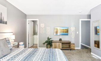 The fully equipped kitchen has all the amenities you need to cook or bake the perfect meal during your stay. We have all the appliances you’ll need, including a dishwasher, Refrigerator, Oven, Stove, Microwave, and Coffee Maker. The open floorplan makes meal times a breeze transitioning to the large dining table, and you can even seat extra family members by the island counter.