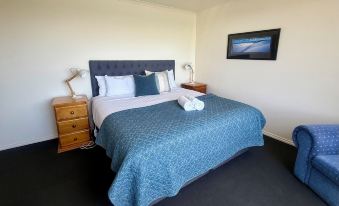 The upper level is open plan, featuring a lovely kitchen, dining area and living room which opens out onto a deck via large sliding doors. Electric hot plates and a clever convection microwave, which can also airfry! You can fire up the gas Weber Q on this deck and enjoy the views. A small laundry is hidden behind sliding doors and has a modern washer, and dryer. The master bedroom is on this level, and features a king size bed, commercially-laundered linen and an en-suite bathroom with modern shower head and complimentary toiletries.