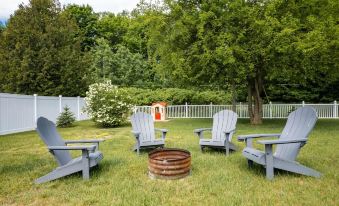 * A fully fenced-in backyard with a Charcoal Grill, Fire Pit, Adirondack chairs, Playset and outdoor games