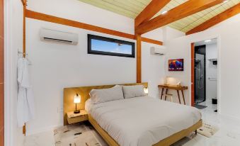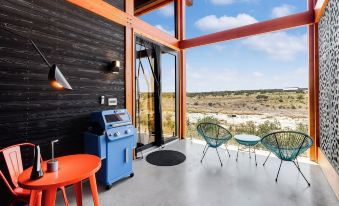 Unique luxury one-bedroom guesthouses on the Pedernales River in Johnson City. Spectacular views. Perfect for a memorable getaway to the Texas Hill Country and wine trail. Each house is ~650 sq. ft., with king bed, a modern bathroom, a living room/fully equipped kitchen, and an outdoor patio. One queen or two twin airbeds can be provided to sleep up to two more, or two couples could rent both houses. (The other house is in a separate listing: Pedernales River Guesthouses - BLUE.) Stairs take you down to the river. No pets. Free Level 2 EV charger for Tesla or J1227.