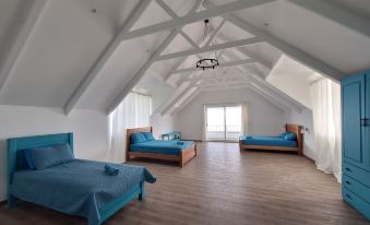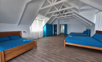 Upstairs, is a large open space room with 2 double beds, 1 twin bed, full bathroom (hot water), and balcony with 180 degree views of the sea. Also, with air conditioning.