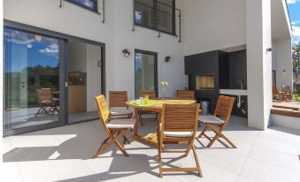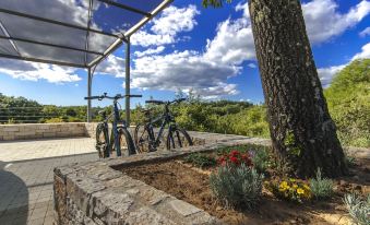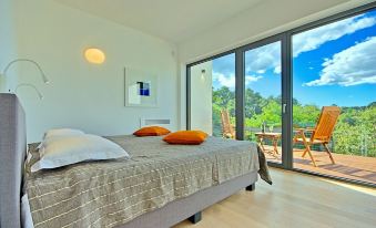 This villa is located on the slopes of the typical Istrian "Vala" with an incredible view of the green landscape and it has been built with great attention to detail. The complex is surrounded by beautiful untouched Mediterranean nature and offers complete peace and privacy. The villa is also a good starting point for an active holiday, since almost all Istrian beaches can be reached in just 20 minutes. Outside there is a beautiful large pool with sun loungers and a jacuzzi. A well-kept and watered lawn with lounge furniture offers perfect relaxation. The Garrten, with a well-equipped outdoor kitchen with a grill, is the perfect place for alfresco dining with a view of nature and the illuminated pool. The interior is flooded with light and nicely decorated, it really feels like a home. There are 3 bedrooms with each private bathroom. Two bedrooms are on the ground floor (one has a gallery with an extra bed ideal for children), and one on the upper floor. The house is fully air conditioned and there is WiFi internet access.