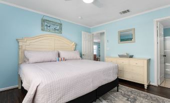 Right next door to the Golf Cart Rental and the Beach, This home has a large open comfortable family room area to sit and visit or watch TV. It has two sofas, two arm chairs and is open to the kitchen which has bar seating and a dining table. The three bedrooms and two baths are perfect for a family weekend or week long stay, plus a pull out queen bed sofa sleeper for the extra sleeping room if you need it!