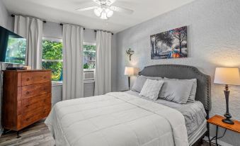 Mix things up with a stay at the Salty Lime Villa #2, a contempory, tropical retreat! It's more than just a place to stay, it's a place to experience! With beautiful views of the Manatee River and situated steps from Mineral Springs Park and the 3 mile long Bradenton Riverwalk, you have quick access to fishing, dining, shopping, beaches, gardens, and historical sites. This newly updated villa is one bedroom (with queen size bed) one bath with walk in tiled shower and fully functional stocked kitchen. There is a queen size sleeper sofa in the living room. The front patio has stunning views of the mile wide Manatee River. The back patio has a fabulous garden view complete with palm trees and a century old Live Oak Tree with babbling waterfall underneath. Head out back to walk the gardens, sit by the waterfall, nap on the hammock, or take a dip in the heated pool. While sitting out back, you can read a book, listen to the birds, watch the abundant butterflies, lizards and dragonflies or play cards/boardgames. If you bring your well behaved pup along, Fido will definitely enjoy the fenced in dog area in the back yard - complete with toys and lots of grass for him to roll around on! While outside, you may detect the faint smell of oranges in the air (we're close to Tropicana)! You will enjoy walking through Mineral Springs Park complete with a spring, boardwalk, fishing pier, big trees and observation tower. You can see manatees, dolphins, sting rays, sharks, pufferfish, crabs and much more! The fishing is awesome here and you have your own grill to bbq whatever you catch. If you'd rather dip your toes in the sand, head over to Anna Maria Islands beaches. It's a quick 15 minute drive from the villa. You will love the sugary sand, turquoise waters and breathtaking sunsets. Another option is to eat and shop on Bradenton's Main Street, right off the riverwalk. Or check out Bridge Street on Anna Maria Island which also has many shops and old Florida charm. Plus it's close to many attractions such as the Manatee Village Historical Park, Bishop Museum, Lecom Park, IMG Academy, Village of the Arts, Mote Aquarium, various nature preserves and the most beautiful beaches in the US. After you enjoy your day doing whatever makes you smile, unwind by watching the gorgeous sunsets over the river from your villa. Once the sun is down, the yard is illuminated by twinkling lights so you can continue to enjoy the outside space. Whatever you choose to do, you will feel comfortable and dreamy staying in Salty Lime Villa #2. We look forward to making your stay as special as it can be!