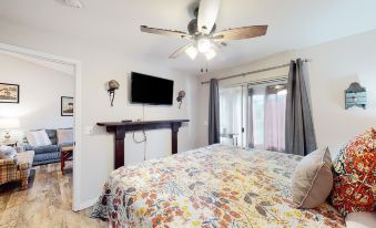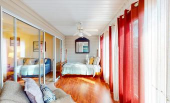 Showcasing a modern farmhouse motif, the stylish interior comes well-appointed for vacation convenience. Gather in the living room and take advantage of the plush sofa and the smart TV with streaming capabilities to host movie nights with ease after full days of excitement. When everyone works up an appetite, the full kitchen is outfitted with everything from traditional drip and K-cup brew coffee makers to all the major appliances for easy meal prep. A cozy sunroom doubles as a third bedroom option. Extra perks include a private washer and dryer, fast WiFi, and central air-conditioning.