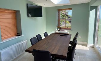 Dining kitchen, with farmhouse style electric range cooker, twin oven, separate grill, and induction hob. Full-size built-in fridge freezer and washing machine. Belfast sink, twin breakfast bars, dining table for 8 with Garden and Sea Views. Wall-mounted smart TV to the dining area. French windows open onto the patio and gardens. Underfloor heating.