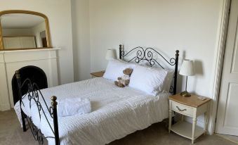 Master Bedroom suite with feature king post trusses, Double Bed, walk-through dressing area to en-suite bathroom with feature slipper bath and underfloor heating. Built-in oak wardrobes and drawers, spectacular Sea Views.