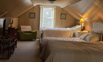The cabin is a cozy 3 bedroom, 1 bath home. There are two bedrooms downstairs, one with a smart TV. The third bedroom is a large bonus room on the second floor with three full size beds, smart TV, tons of DVDs and player, and a bin of toys and games for kids to enjoy! The kitchen is stocked with dishes, pots, pans, silverware, cooking utensils, anything you need to cook. The kitchen and living room are an open space, with a large smart TV. All smart TVs have a Roku set up - enjoy free channels or feel free to log into your streaming channels while you're there.