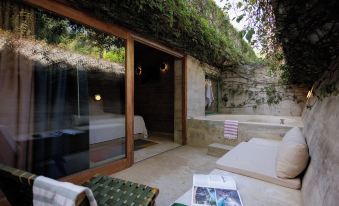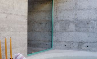 The room is brutalist cave design, and it's cool, but there are flaws. Only luke warm water due to 'sun boilers', you stub you toe on all the concrete, there are 3 very sharp steps up to the toilet in its separate closet - not convenient in the middle of the night. No inside chair or desk, no tv, open concrete shower where water splashes out. Cool private outside patio but there are even higher concrete steps with wood 1/2 steps, to reach it. The mosquito folding screen does not have a tight fit. Functionally, the room comforts could be better.