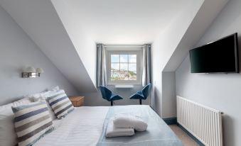 In a prime position overlooking the harbour with parking available close by. Rooms quirky but spotlessly clean. Staff especially Barry and Nicky were professional , efficient and oh so friendly. They made our stay.