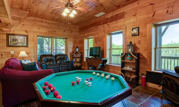 No words or pictures can do justice to the jaw-dropping beauty of this incredible mountain getaway, at 3,300 feet in elevation. From the rough-hewn log construction and hardwood floors, to the fully equipped kitchen. Stroll into the finely-furnished living room and you’ll find comfy spaces to enjoy conversation, perhaps in front of the stone wood burning fireplace and wood stove ( free firewood is provided ) or the 42” Smart LCD TV. Head down to the game room to watch the big game on Directv Satellite or challenge someone to an air hockey showdown or corn hole, or a game of bumper pool.