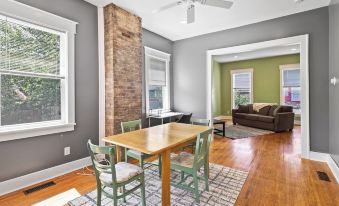 Dining Room: Table and chairs for four guests, exposed brick chimney, ceiling fan and a corner desk with chair for office work.