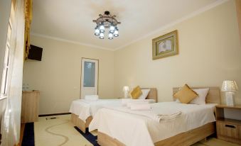 Отель очень понравился.Идеально чистый,уютный,прекрасные завтраки.В ванной комнате полы с подогревом.Удобный шкаф для вещей.Отель новый.Прекрасная звукоизоляция.Близко все достопримечательности.На кухне есть электрочайник и микроволновка.Приветливые хозяева.Несколько огорчило,когда при отъезде у нас не хотели принимать номер,т.к.была предъявлена претензия,что белое полотенце испачкано краской для волос и якобы это в данной гостинице не первый случай.Уважаемые хозяева,таких случаев будет много.Загрязненное полотенце не повод портить настроение гостям.К тому же краска была едва заметна.Один из способов добавить при стирке нашатырный спирт,или просто сделайте цветными ваши полотенца.Не стала снижать за это оценку т.к.отель очень достойный.Рекомендую гостям Бухары.