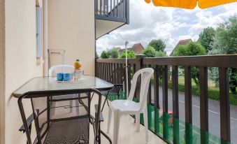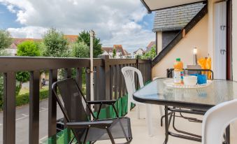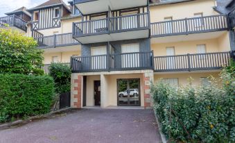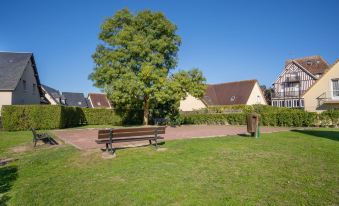 Residence "Fleur Marine". Nella località, a 1 km dal centro di Cabourg, a 300 m dal mare, a 300 m dalla spiaggia, accesso diretto alla spiaggia. In comune: campo da bocce, parcheggio (numero posti limitato). Negozio 1 km, negozio alimentare 1 km, supermercato 900 m, ristorante 1 km, bar 1 km, noleggio biciclette 550 m, fermata bus "Plage" 450 m, spiaggia sabbiosa 300 m, piscina termale "Thalazur" 500 m. Porto turistico 3 km, campo da golf (9 buche) 1.2 km, tennis 700 m, mini golf 2.3 km, centro sportivo 500 m. Attrazioni nelle vicinanze: Deauville 26 km, Honfleur 48 km, Caen 25 km. Prego notare: no ascensore. La foto della casa va considerata come un esempio. Composto da case a schiera di 2 piani e edifici a 3 piani in stile normanno.
