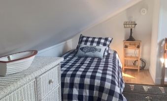 The entire house has new hardwood floors, a new kitchen and fresh paint. The cottage is fully furnished and well equipped with "Pottery Barn" style furnishings. There are 2 bedrooms each with a queen bed. Upstairs is a kids loft area. There is one full bath downstairs with tub/shower. All linens and towels are included. There is a washer and dryer in the basement. The house has an enclosed front porch with chairs and a queen bed. The detached garage provides a rustic getaway with Adirondack style chairs and table for quiet reading or projects. A Weber Q gas grill is also provided.