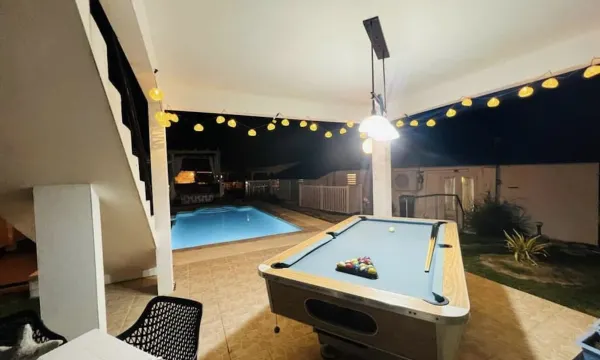 The location is private (gated entry) and the community is quiet. Short distance to the beach which is also private (key fob needed) the surrounding area has very little to offer other than a few kiosks with ok food and drink. The beach was very nice. Quiet side for kids where a rock outcrop protects the shore line and a more traditional beach where the sand was nice and the waves were not that rough. Only for experienced swimmers. Very few people on the beach. The house had a well equipped kitchen and sufficient beach equipment, but two of the beach chairs provided were broken. Plenty of chairs outside to lounge by the pool or on the balcony. The billiards table was covered and out of the sun but lining up shots could be difficult with the possibility of slipping off the patio. Outdoor kitchen had two grills and a gas range with refrigerator. Owner was responsive.