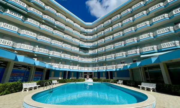 Appartamento con una camera da letto situato al 5° piano di un edificio con ascensore e piscina esterna in comune, a soli 8 metri dalla spiaggia. Può ospitare fino a cinque persone. L'immobile è composto da un soggiorno/sala da pranzo con divano letto matrimoniale, angolo cottura a vista, una camera con letto matrimoniale e letto a castello e un bagno completo con box doccia e lavatrice. La caratteristica principale è l'ampio balcone con una splendida vista mare. Non è disponibile un posto auto. L'aria condizionata è disponibile a un costo aggiuntivo (vedi sotto). °Le piscine sono aperte stagionalmente (metà giugno/inizio settembre): le date esatte possono variare a causa delle condizioni meteorologiche o di manutenzione.