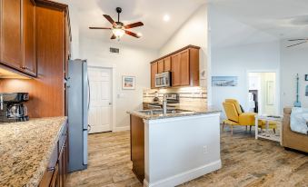 Inside, the home features a vibrant and stylish decor that's sure to make guests feel right at home. There is large flat screen TV mounted so you can stream your favorite shows and movies by using the complimentary Wi-Fi. The kitchen is fully equipped with top-of-the-line stainless steel appliances, making it easy to whip up favorite meals during their stay. There is also a dining table with seating for 6 guests!