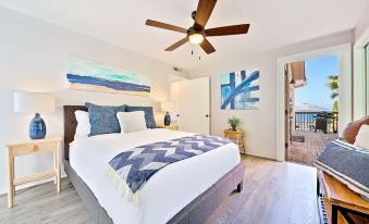 This two-bedroom, two-bath, 1,400-square-foot, single-story cottage has had some modern updates and sports all new furniture both inside and out, all of which will delight the pickiest of guests. The great room, with a large window flanked by original stain glass overlooking the awe-inspiring Pacific Ocean, sports a large TV and a cozy and comfortable seating cluster.