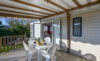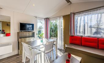 Camping Les Salines: Resort. 30 houses in the resort. In the resort 500 m from the centre of Carnac, 1.5 km from the sea, 1.5 km from the beach. For shared use: hot tub, barbecue. In the house: WiFi, washing machine (extra). Grocery, supermarket 20 m, restaurant, bar 400 m, bakery 500 m, café 100 m, bus stop 600 m, sandy beach "Grande Plage de Carnac" 1.5 km, thermal baths "Thalazur Carnac" 1.2 km. Golf course (18 hole) 15 km, surf school 3.5 km, sailing school 1.5 km, tennis 2.9 km. Nearby attractions: Les Alignements de Carnac 1 km, Le Port de la Trinité-sur-mer 5 km, Auray & Saint-Goustan 19 km, Les remparts de Vannes 33 km, La Presqu'île de Quiberon 16 km, Lorient 49 km. Hiking paths: Golfe du Morbihan 20 km. "Le Tadorne", 3-room mobile home 32 m2. Comfortable furnishings: living/dining room with TV (flat screen). Exit to the terrace. 1 room with 2 beds (90 cm, length 190 cm). 1 room with 1 double bed (140 cm, length 190 cm). Kitchenette (4 hot plates, oven, toaster, kettle, microwave, electric coffee machine). Shower, sep. WC. Heating. Terrace 5 m2. Terrace furniture, barbecue. Facilities: hair dryer. Internet (WiFi, free). Parking. Please note: maximum 1 pet/ dog allowed. Smoke alarm. Offer by a commercial proprietor according to Art. 155, IV, CGI