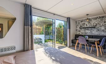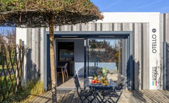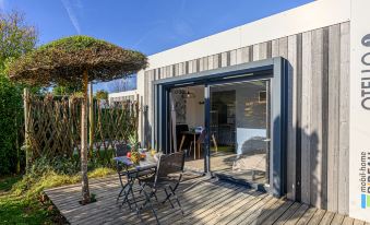 Camping Les Salines: Resort. 30 houses in the resort. In the resort 500 m from the centre of Carnac, 1.5 km from the sea, 1.5 km from the beach. For shared use: hot tub, barbecue. In the house: WiFi, washing machine (extra). Grocery, supermarket 20 m, restaurant, bar 400 m, bakery 500 m, café 100 m, bus stop 600 m, sandy beach "Grande Plage de Carnac" 1.5 km, thermal baths "Thalazur Carnac" 1.2 km. Golf course (18 hole) 15 km, surf school 3.5 km, sailing school 1.5 km, tennis 2.9 km. Nearby attractions: Les Alignements de Carnac 1 km, Le Port de la Trinité-sur-mer 5 km, Auray & Saint-Goustan 19 km, Les remparts de Vannes 33 km, La Presqu'île de Quiberon 16 km, Lorient 49 km. Hiking paths: Golfe du Morbihan 20 km. "Otello 3 - L'Ibis rouge", 1-room bungalow 20 m2. Comfortable furnishings: dining room with 1 french bed (1 x 160 cm, length 200 cm), TV (flat screen). Exit to the terrace. Kitchenette (2 hot plates, toaster, kettle, microwave, electric coffee machine). Shower/WC. Heating. Terrace 5 m2, south facing position. Terrace furniture. Facilities: Internet (WiFi, free). Parking. Please note: maximum 1 pet/ dog allowed. Smoke alarm. Offer by a commercial proprietor according to Art. 155, IV, CGI